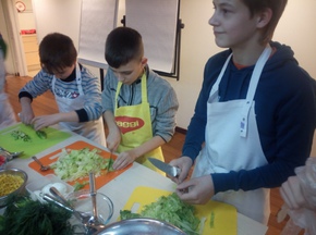 После начали кулинарную битву! Команды получили задания и отправились на кухню, где под руководством поваров и волонтёров компании ребята приготовили вкуснейший обед, который затем был дружно и с аппетитом съеден весь до крошки!