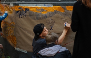Вместе с художницей Ирой Светличной участники нарисовали «легальные граффити»: оккупировали дворик в Сивцевом Вражеке, послушали экспресс-лекцию про уличное искусство, повесили два больших листа крафта на стены дома и порисовали на них.