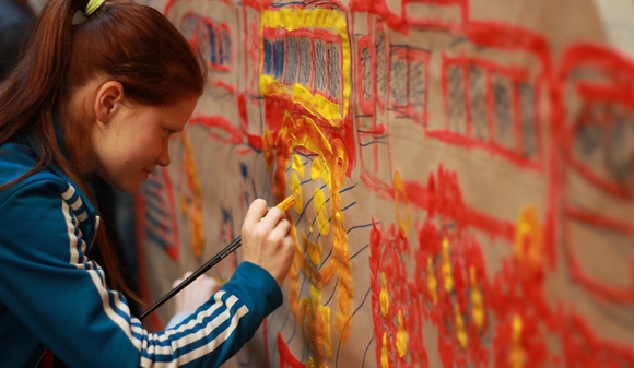 Ребята вспомнили как они добирались до Москвы, и это стало идеей двух коллективных работ. А потом две команды поменялись своими рисунками и нашли в них себе место, изобразив себя на другой картине.