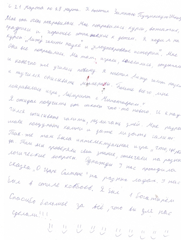 «С 21 по 28 марта я была в ЗПШ. Я ходила на ленты. Мне нравится математика и иностранные языки, поэтому я ходила на математический курс «Попробуй реши» и иностранный «Галопом по Европам с заездом в Китай». На курсе «Попробуй реши» мы играли в полоску, в мудрецов, в делители. Нас было на курсе более 25 человек. Было очень интересно и познавательно. На курсе «Галопом по Европам» мы в разные дни недели изучали разный иностранный язык. В понедельник у нас был китайский, во вторник мы изучали немецкий, среда - итальянский, четверг - испанский и в пятницу - английский язык. Мне очень понравились оба эти курса. Единственное что я хотела бы изменить, так это добавить французский язык. Вели эти курсы хорошие преподаватели. Я узнала много нового и интересного, узнала как пишется моё имя на всех этих языках. Я задавала различные вопросы, которые меня интересовали и получала хороший и полный ответ.