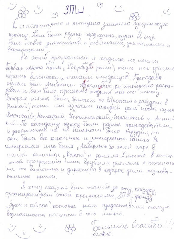 Я очень надеюсь что в 2016 г я поеду в ЗПШ. Мне очень всё понравилось. Спасибо за проведённое с нами время.»