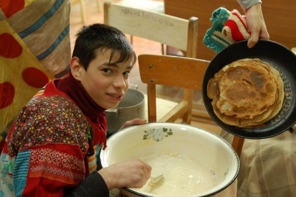 «Странно, что за 5 лет и с полсотни поездок в Новогурово, Масленицу мы играли первый раз. Наверно, казённое веселье на площадях и в парках Москвы не добавляло этому празднику очарования в наших глазах. Но потом случилось два события. Во-первых, мы познакомились с Рождественкой - людьми, которые делают Бакшевскую Масленицу (и много другого интересного и хорошего). А во-вторых, пришла основная идея - дети сами должны сделать себе праздник. Приехали рано утром и всю первую половину дня вместе готовились - на кухне дети пекли блины, пацаны строили снежную крепость, другие вязали чучело из лапника. Девочки ходили по школе и подбирали всем костюмы. Некоторые (обалденные!) наряды были из Реутовского ТЮЗа (спасибо костюмерам Ларисе и Галине). Но даже простой вырезанный из цветного ситца платок и связка баранок на шею создавали праздничное настроение (связки к началу праздника существенно укоротились :)). Вся интернатская мелочь радовалась, что снова приехали Света Гильманова и её подруга Яна - на этот раз кукол мастерили не из жёсткого гороха, а из мягких, душистых трав. Каждому нашлось занятие, и каждый внёс посильный вклад. А после обеда был праздник. Замечательные, всё знающие и умеющие Рита и Ира управляли играми и хороводами, Лёша отложил бензопилу и достал баян, кипел самовар, на мангале разогревались блины, и снег сверху только улучшал фотографии. Снежную крепость мы взяли, чучело Зимы сожгли, и вот уже третий день светит яркое весеннее солнце - может и есть что-то в этих языческих ритуалах :).