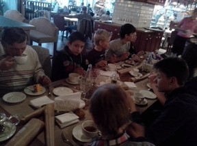 Ужинать, как водится, ходили в кафе Му-му - это кафе очень нравится нашим ребятам, ведь каждый может сам себе выбрать то, что ему хочется, самостоятельно занять столик, что так непривычно для ребят, у которых всегда в детском доме стол накрыт тем, что приготовили повара по меню.