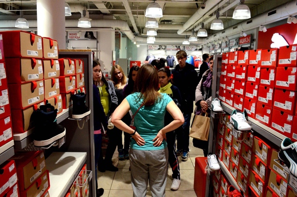 Пообедав в Шоколаднице, уже спешим к следующему пункту: нельзя терять ни минуты! Нас уже ожидали в магазине PUMA. Здесь ребятам предстояло почувствовать себя в роли настоящих продавцов-консультантов. Ире из Елатьмы особенно понравилось подбирать комплекты одежды и брать интервью у работников магазина.