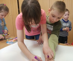 И начали работу двумя командами. Первая пошла в магазин закупать продукты, а вторая отправилась в младшую группу – ребята решили сделать сюрприз воспитателю малышей Валентине Анатольевне, которая праздновала день рождения. Вместе с младшими наши участники сделали большую открытку – солнце с лучами-ладошками, на которых старшие помогли записать придуманные младшими пожелания. Завтра большая открытка будет вручена имениннице! Довольные малыши пошли гулять.