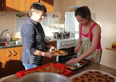 Выбранное блюдо вдохновило ребят на придумывание самых разнообразных и любимых начинок, долго обсуждали все идеи и выбирали, с чем же делать пиццу, записали все пожелания, составили список продуктов, и желающие отправились в магазин с Лешей. А потом взялись за дело. Аня мяла масло, Рома перемешивал все миксером, Катя с Машей месили тесто для пиццы, Андрей нарезал курицу, Яна жарила грибы с луком. Антон ходил и все фотографировал. Все активно мыли овощи, нарезали ингредиенты и смазывали формочки для кексов, которые заодно решили испечь к чаю. В итоге получилось 3 больших противня с пиццей и несколько десятков кексов. А из остатков теста ребята с Лешей нафантазировали булочки, некоторые украсили оставшимися от пиццы маслинами.