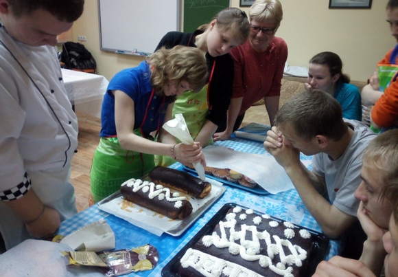 А когда мальчики вернулись, все бросились помогать раскладывать продукты и готовиться к изучению новых рецептов. И не звя! Ведь сегодня сладкий день – рулеты, кексы и торт! Начали сразу с рулетов и кексов. Ребята с интересом слушали, как делать разное тесто. По очереди взбивали бисквит миксером. К обеду кексы были готовы, а рулеты надо было ещё украсить. Когда ребята отдохнули после обеда, то сразу взялись за творожный торт, пропитывали печеньки молоком, вымешивали творог с изюмом и творог с какао. А поскольку мешали руками, то потом, весело хохоча, Маша, Вова и Настя облизывали свои руки. Перед самым ужином взбили сливки и украсили торт и рулеты.