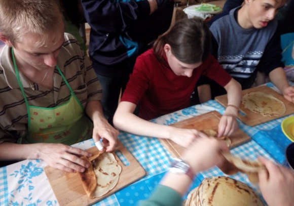После тихого часа снова собрались в кабинете СБО. Часть мальчиков играли в футбол, а девочки и оставшиеся мальчики пекли блины и делали к ним фарш. Каждый попробовал сам испечь блин, не у всех получалось с первого раза. Но в итоге получилась целая гора блинов! А те, кто уже попробовалпечь блины, развлекались, задавая вопросы книге с предсказаниями. После ужина накрыли столы и устроили пир! Все, включая приглашённых воспитателей, ели и хвалили солянку, а затем пили чай с фаршированными блинами. Сытые и довольные все пошли спать.