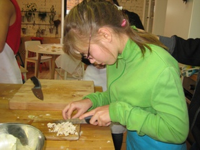 На четвёртый день программы, позавтракав кашей, собрались в Зелёную Школу. Там решили готовить обед. Взяли с собой ингридиенты и вдохновение. По дороге в парке нашли белок и покормили их орехами и семечками. А на кухне Зелёной школы все взялись за работу! Чистили, резали, мыли, складывали, варили, и в результате получилась вкусная солянка, отличный крабовый салат и горячие бутерброды! Ели с аппетитом – ведь сами приготовили! Сытые и радостные пошли кормить кроликов приготовленной заранее морковкой.