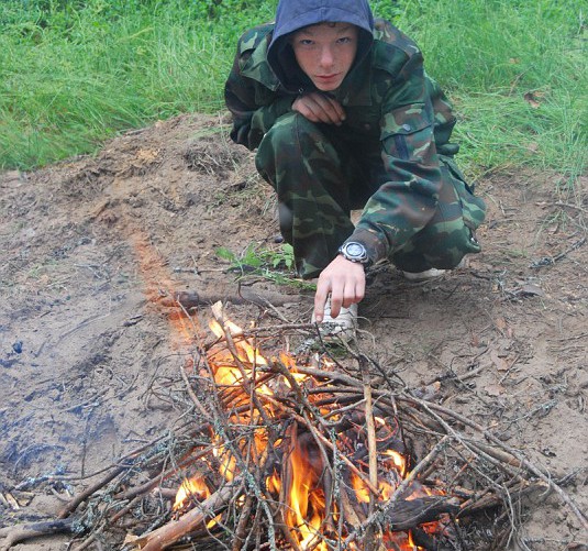 костер, кипятили воду, готовили обед. Поскольку дрова были влажные, задача