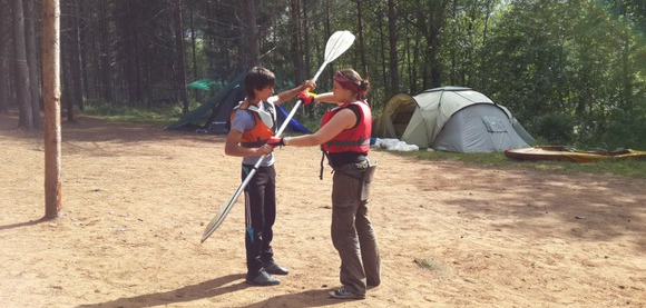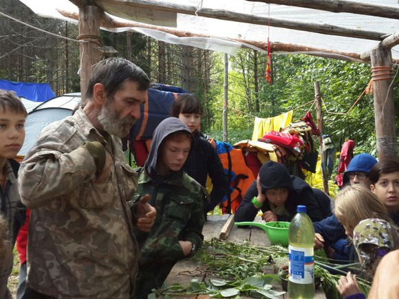 Пятый день. Утро встретило нас моросящим дождиком. Под предводительством инструкторов Ширы, Даши и Фаи мы все наколдовали солнышко на время бани, и оно светило нам почти весь день. Баня была сегодня жаркой, а ребята возвращались чистые и довольные. Однако, как только все помылись, дождь снова взял своё. После дождливой ночи не все спальники остались сухими даже у тех, кто ночевал в палатках. Поэтому сегодня инструктора научили робинзонов очень быстрому способу просушки спальников, чтобы ночью снова было тепло.
