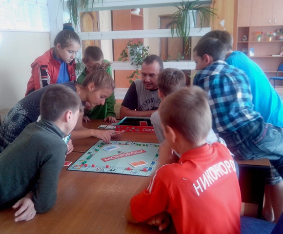 Затем пошли к тем ребятам, которые пока ещё остаются воспитанниками детского дома. Выслушали много рассказов о летнем отдыхе, похвастались друг перед другом загаром. В этот раз мы привезли ребятам игру, в которую они пока ни разу не играли – «Монополия». Вместе разобрались с правилами и начали игру. Желающих было так много, что пришлось разделиться на пары. Не все решились участвовать в игре, Вика, Ваня и Настя с удовольствием наблюдали за баталией. Особенный азарт вызывало участие в аукционе. Ребята увлечённо перепродавали друг другу улицы, торговались до последнего.