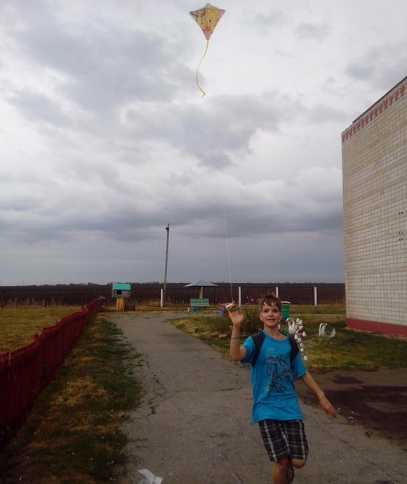 Перед отъездом пошли пускать воздушных змеев на улице. День был безветренный и ребятам пришлось быстро-быстро бегать, чтобы поднять змея в воздух. Впрочем, делали это они с большим удовольствием.