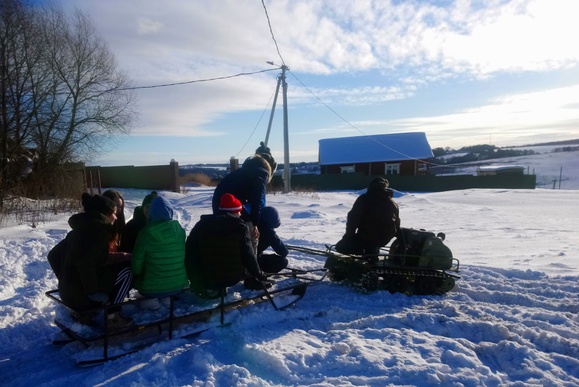 Даня, Даня, Вова, Даша, Света, Алина, Полина отправились кататься на мото-собаке, которую тут же обозвали чудо-газонокосилкой и прицепили к ней сани, чтобы влезали все. Лейла решила не выходить из дома, устроившись играть в настольные игры с присоединившимися к ней позже Полиной и Светой.