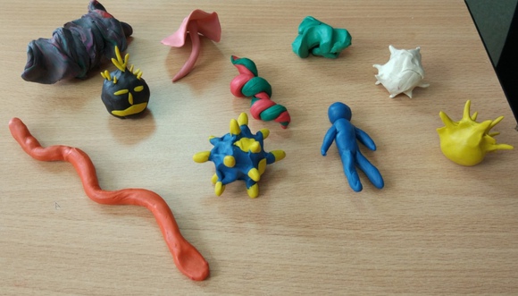 Ребята сами рассказали, что положительным качеством страха является безопасность. Поговорили о своих страхах и нарисовали их, а после нарисованные страхи превращали в смешные и забавные. Например, страх молний превратился в симпатичную рожицу. Про печаль говорили с трудом. Ребята были удивлены, что плакать в состоянии горя не только можно, но важно и полезно. О злости разговор вышел гораздо более длинный и насыщенный. Ребята рассказали, как они поступают, когда злятся, и мы обсуждали, какая из этих реакций приносит пользу. Чтобы понять, как у кого злость выглядит, мы слепили ее из пластилина. И стали появляться колючие шары, змеи, неприятные человечки и даже розовая поганка. Полюбовавшись на нашу выставку гнева, мы перешли самому приятному чувству – радости. Пробовали в разных играх вызывать радость у себя и у других.