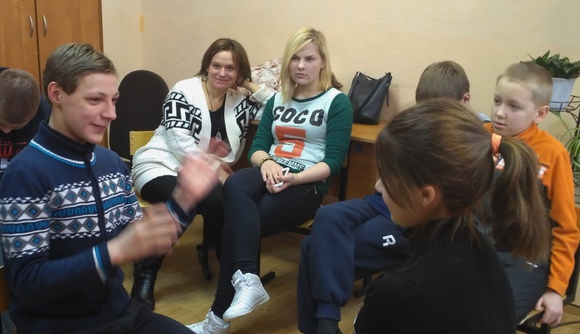 Для разминки еще раз познакомились, поскольку на занятие приехали и волонтеры фонда – некоторые из них в первый раз. Плюс к обычному знакомству каждый из ребят называл 2-3 качества, за которые он себя любит. Это удалось легко и интересно, что порадовало ведущих.