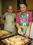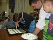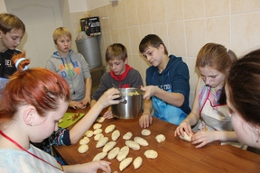 Из актового зала мы перешли на кухню и начали готовить с Лёшей. Сегодня решили делать пирожки и пиццу, а чтобы веселей было готовить, мы придумывали продуктам другие названия на тему «пятницы 13». Начинка в пирожках была из летучих мышей, тесто назвали мозгами троллей. Были ещё галлюциногенные грибы (шампиньоны), жуки (маслины) и др. А затем мы всё это съели!