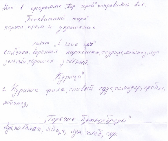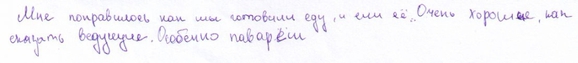Пришли все воспитатели и педагоги, пробовали и очень хвалили. Одна из воспитателей спросила рецепт, и Стас, Карина и Сережа ей всё сами продиктовали без нашей подсказки! Мы решили, что таким образом они сдали экзамен. До отъезда всё помыли и убрали на кухне и снова сыграли в «Мафию». Когда пришло время уезжать, все долго обнимались, и мы договорились о встрече 2 марта в компании Nestle, где ребят ждёт продолжение программы.