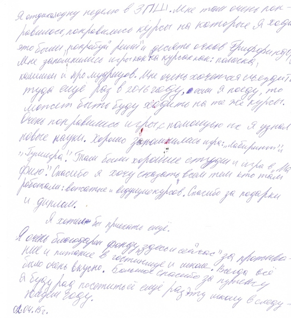 Я очень надеюсь что в 2016 г я поеду в ЗПШ. Мне очень всё понравилось. Спасибо за проведённое с нами время.»