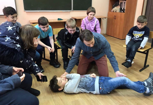 После небольшого перерыва начали перебирать различные ситуации и выяснять, как в них поступать. Спасались от ран, кровотечений, ожогов, обморожений, отравлений, переломов. Ребята попробовали класть друг друга в специальное безопасное положение, проверять дыхание и помогать, если подавился. А после занятия наперебой рассказывали, что запомнили.