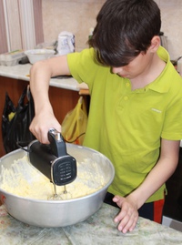 Выбранное блюдо вдохновило ребят на придумывание самых разнообразных и любимых начинок, долго обсуждали все идеи и выбирали, с чем же делать пиццу, записали все пожелания, составили список продуктов, и желающие отправились в магазин с Лешей. А потом взялись за дело. Аня мяла масло, Рома перемешивал все миксером, Катя с Машей месили тесто для пиццы, Андрей нарезал курицу, Яна жарила грибы с луком. Антон ходил и все фотографировал. Все активно мыли овощи, нарезали ингредиенты и смазывали формочки для кексов, которые заодно решили испечь к чаю. В итоге получилось 3 больших противня с пиццей и несколько десятков кексов. А из остатков теста ребята с Лешей нафантазировали булочки, некоторые украсили оставшимися от пиццы маслинами.