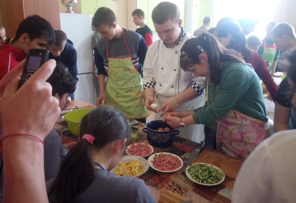 Когда пришло время готовить, ребята объединились в две комманды: «Шефы» и «Солёные огурчики». «Шефы» стали готовить «Оливье» и «Солянку», а «Солёные огурчики» – салат из крабовых палочек. Ребят пришло много, но всем нашлось дело. Кто-то нарезал, кто-то чистил, кто-то следил за кастрюлями. А маленькая Настя была «феей чистоты». Мальчики Витя, Серёжа и Максим чистили лук. Ира, уже приезжавшая к нам на программы, успела сделать очень многое: резала куриное филе, нарезала овощи в салат, лимоны в солянку. Салаты отнесли в столовую и всем раздали с обедом.