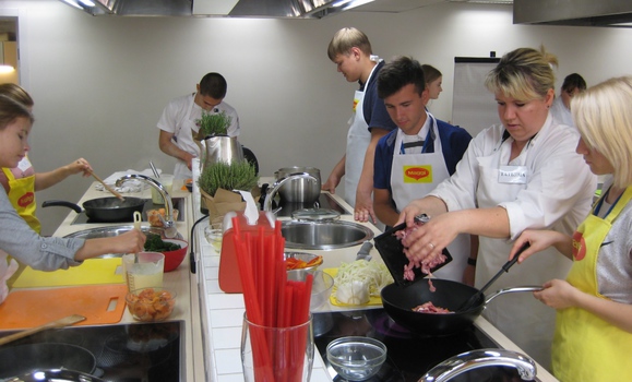 А еще в этой же компании под руководством хороших поваров мы приготовили несколько блюд и напиток – суп «Солянка», мясо по-японски, салат «Цезарь», конфеты «Трюфель», шоколадный коктейль. Приготовив к обеду данные блюда и накрыв на стол, мы поели.