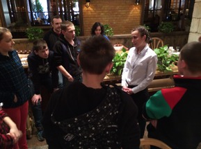 Обедали в потрясающем месте – «Шайка-лейка». Всё было очень вкусно и сытно, а потом о своей работе нам рассказали официанты, кондитеры и администраторы. А мастер по приготовлению чая показал как сварить необычный чай из облепихи, мёда, корицы и других ингредиентов. Сваренные чаи попробовали, вдохновились вкусом и попытались запомнить все входящие ингредиенты и способ приготовления, чтобы дома попробовать сделать вкусный чай самим. Спасибо «Шайке-лейке»!