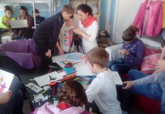 На следующий день с раннего утра, позавтракав, делали свой мультфильм. Для этого к нам пришла Саша Мирзаханова, рассказала, как делаются мультфильмы, и самые активные взялись за фломастеры, карандаши и ножницы, придумали сюжет, нарисовали фон и создали героев. Затем последовали съёмка и монтаж.