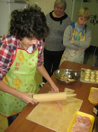 Когда продукты принесли все начали спрашивать у Лёши, что им делать, и он каждому помог найти занятие. Работа закипела. Запекали куриные грудки с грибами, помидорами и сыром. Ещё делали рулетики. Ребята всё запомнили и делали сами от начала и до конца. Оставалось ещё время, и мы решили сделать горячие бутерброды. А затем, как всегда, начался пир!