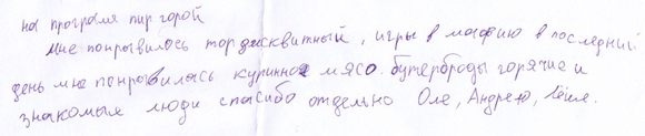 Пришли все воспитатели и педагоги, пробовали и очень хвалили. Одна из воспитателей спросила рецепт, и Стас, Карина и Сережа ей всё сами продиктовали без нашей подсказки! Мы решили, что таким образом они сдали экзамен. До отъезда всё помыли и убрали на кухне и снова сыграли в «Мафию». Когда пришло время уезжать, все долго обнимались, и мы договорились о встрече 2 марта в компании Nestle, где ребят ждёт продолжение программы.