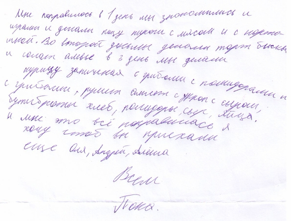 Дождавшись, когда проснутся все ребята, стали составлять список продуктов, которые сегодня понадобятся. Девочки Аня, Оля и Кристина пошли с Лёшей в магазин. Пока мы их ждали, пили чай со вчерашним тортом и угощали им тех, кто вчера не попробовал.