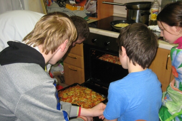 Из актового зала мы перешли на кухню и начали готовить с Лёшей. Сегодня решили делать пирожки и пиццу, а чтобы веселей было готовить, мы придумывали продуктам другие названия на тему «пятницы 13». Начинка в пирожках была из летучих мышей, тесто назвали мозгами троллей. Были ещё галлюциногенные грибы (шампиньоны), жуки (маслины) и др. А затем мы всё это съели!