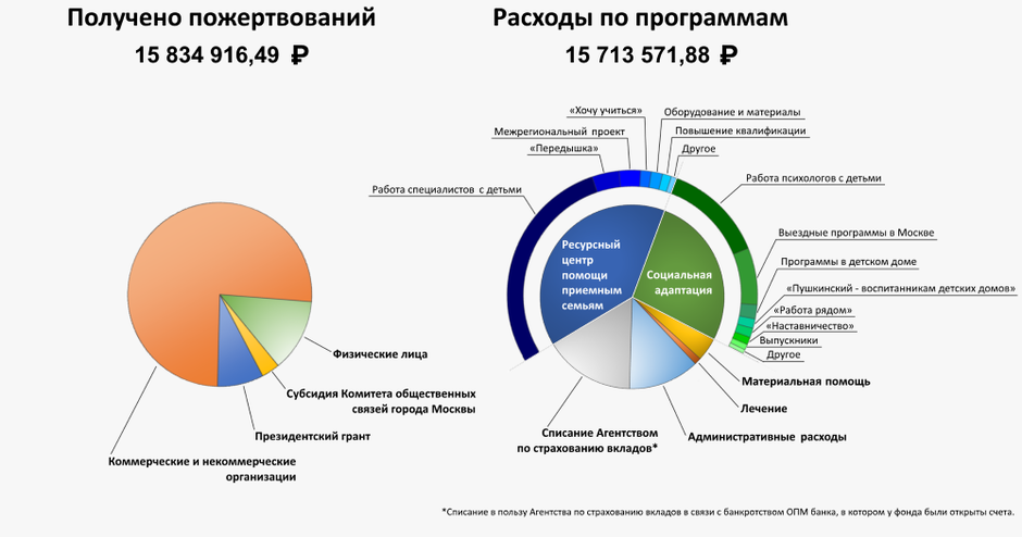 Общий объем расходов фонда в 2017 году составил 15 713 571,88 рублей. На эти средства были реализованы программы социальной адаптации воспитанников и выпускников детских домов и программы помощи принимающим семьям, оплачена медицинская помощь, приобретено оборудование и материальные ценности для детских сиротских учреждений, приемных семей и выпускников, реализован межрегиональный проект. 2 503 000,00 рублей были списаны в пользу Агентства по страхованию вкладов в связи с банкротством ОПМ банка, в котором у фонда были открыты счета.